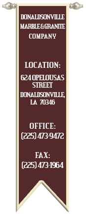 © Copyright 2010 Donaldsonville Marble & Granite Company. All Rights Reserved. Information subject to change. Any duplication, facsimile, or reference to any photographs or graphic material are strictly prohibited. web design: Allison Ezidore:Créations de Dieu |